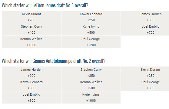 BetDSI has posted prop bets surrounding the selection process. Kevin Durant is the favorite to be selected No. 1 overall by James, while Kemba Walker is projected to be the final starter taken in the draft.